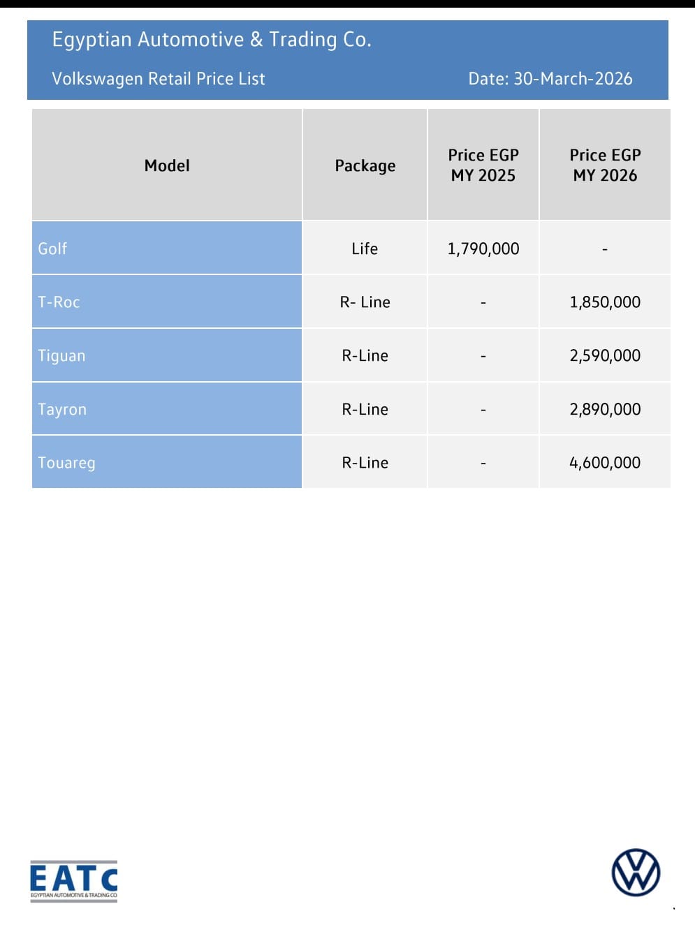 أحدث التعديلات في قائمة أسعار سيارات “Volkswagen”