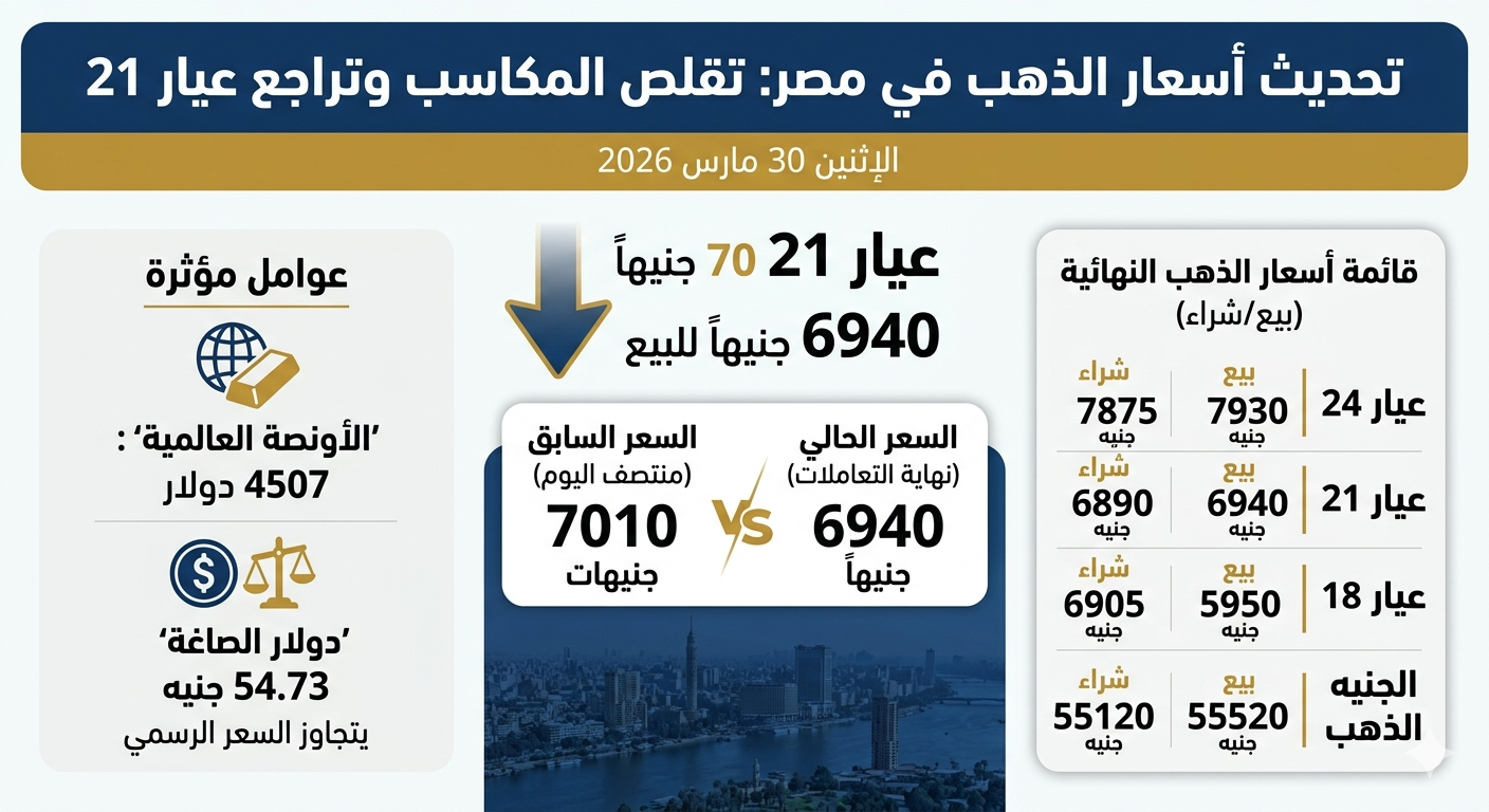 قلصت أسعار الذهب في مصر اليوم، الإثنين 30 مارس 2026، مكاسبها بنهاية التعاملات المسائية، حيث تراجع عيار 21 -الأكثر شيوعاً- بقيمة 70 جنيهاً للجرام الواحد، مسجلاً 6940 جنيهاً للبيع، بعد أن كان قد وصل إلى 7010 جنيهات في منتصف اليوم.