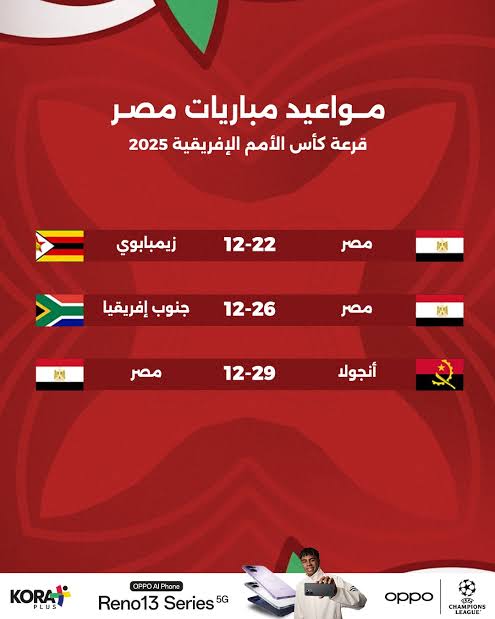 - ثم يواجه المنتخب المصري نظيره جنوب أفريقيا يوم 26 ديسمبر، في تمام الساعة 5 مساء بتوقيت القاهرة.